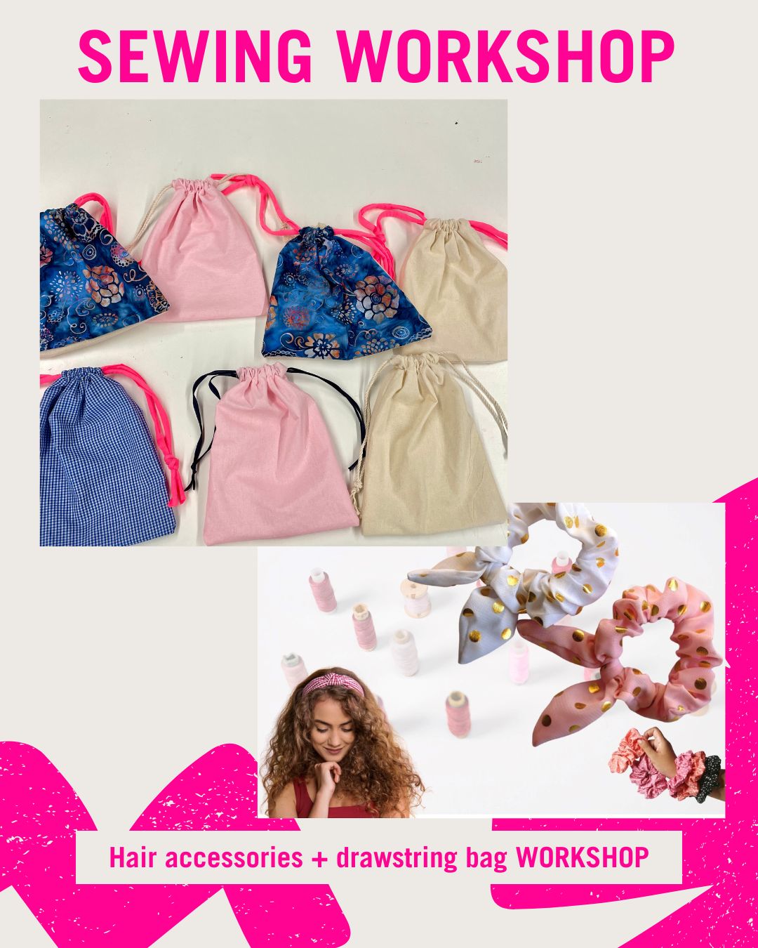 Take Home: 2–3 handmade hair accessories and a drawstring bag